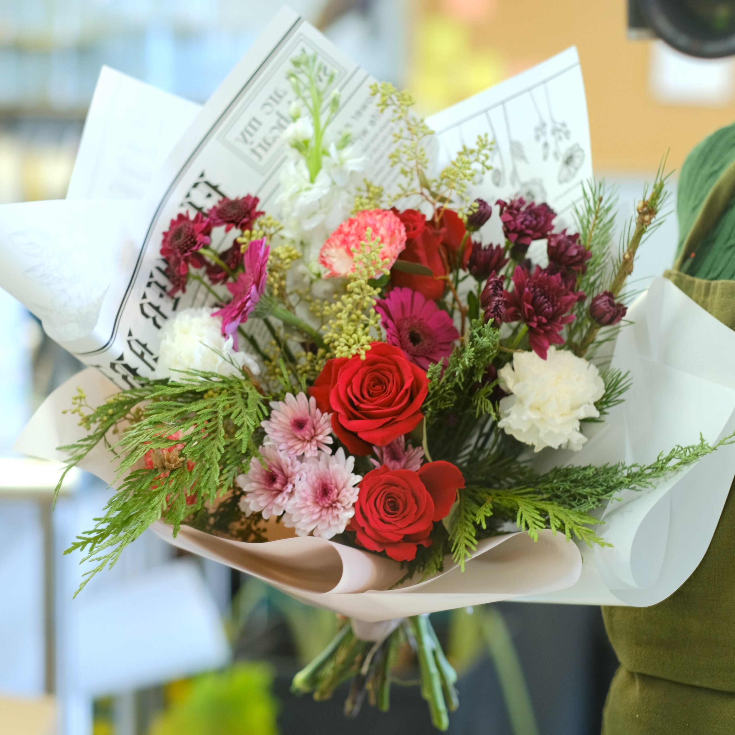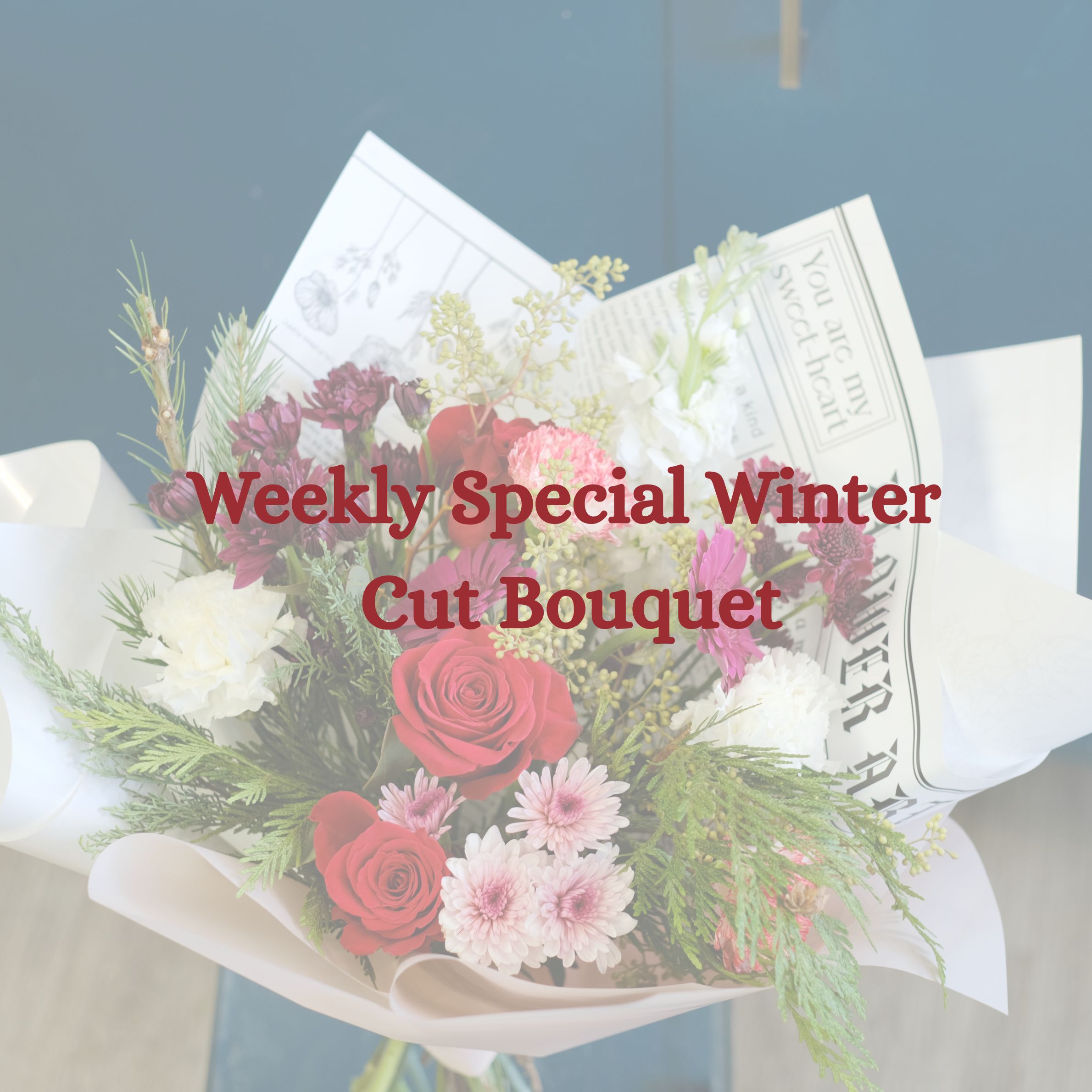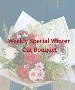 Designed with the cozy charm of winter in mind, each bouquet highlights a blend of crisp whites, festive reds, soft winter greens, and elegant accent flowers that change weekly based on the freshest arrivals.